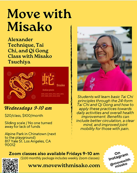 During these online classes, Misako offers lessons incorporating Alexander Technique, Tai Chi, and Qi Gong. Misako provides demonstrations, while students will practice gentle warm-ups and movements. She explains in detail the mechanics of each movement and the principles of Tai Chi, while sharing how students can add them to their daily lives. Recordings are available for 1 week. (For students unable to attend, recordings are still available for a cost of $20)